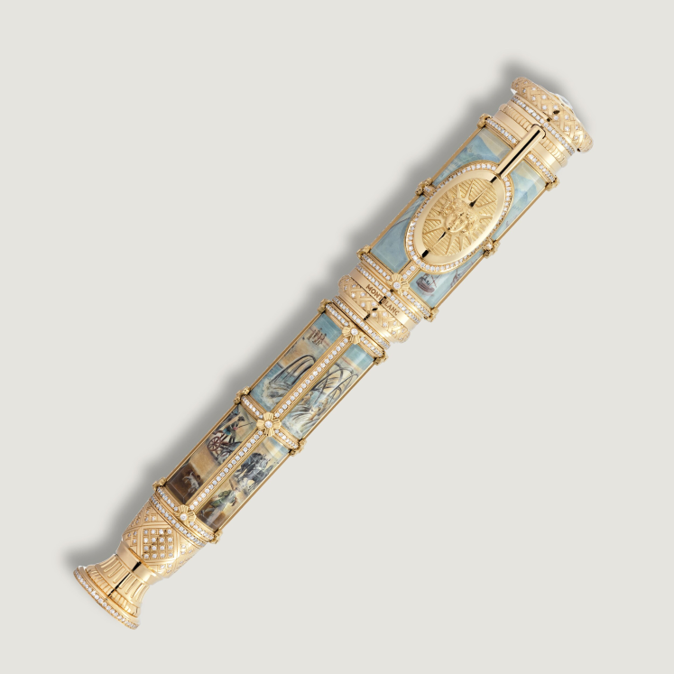 • Corps : Corps en or massif Au 750/1000 avec incrustations d’émail enrichies d’une peinture miniature, orné de diamants taille brillant