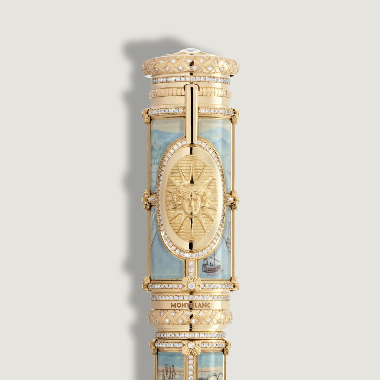 Versailles et le roi Louis XIV – indissociables jusqu'à aujourd'hui. Le goût du roi pour le grandiose se manifeste non seulement dans l'ampleur du château et ses jardins somptueux, mais surtout dans les 2 300 pièces de la résidence royale. Le mobilier et les décorations raffinés, réalisés à partir des matériaux les plus nobles, incarnent le style et la splendeur royaux. Le château de Versailles est plus qu'un simple bâtiment, c'est une œuvre d'art baroque à part entière, où l'architecture, l'aménagement des jardins et les arts décoratifs s'harmonisent à la perfection. Louis XIV rêvait de transformer l'ancien pavillon de chasse de son père en une résidence monumentale et en un centre du pouvoir politique et de la vie culturelle en France. Avec la collection « A Journey through Château de Versailles », Montblanc propose une visite guidée de ce chef-d'œuvre baroque afin de célébrer le site de Versailles, classé au patrimoine mondial. Avec le superbe A Journey through Château de Versailles Limited Edition 3, les maîtres artisans de Montblanc évoquent un sentiment de nostalgie grâce à leur savoir-faire extraordinaire. Donnant vie à la magie du château, cette édition attire le regard de la spectaculaire galerie des Glaces vers son jardin enchanteur. Les artistes joailliers ont transposé la majesté qui émane du cœur du palais sur ce Limited Edition 3 en appliquant habilement des incrustations d'émail facetté pour rehausser le capuchon et le corps de l'instrument d'écriture en or massif Au 750/1000. Ces miniatures d'une finesse à couper le souffle représentent la vue des jardins telle qu'elle se reflète dans les miroirs spectaculaires de la galerie, plongeant le spectateur dans l'ambiance historique du XVIIe siècle. Chaque incrustation est encadrée de bandes d'or, artistiquement serties à la main de diamants et de fleurs délicates, faisant écho à l'esthétique caractéristique de Versailles. En l'honneur de Louis XIV, le « Roi Soleil », le soleil occupe une place centrale dans cette édition : l'agrafe artistiquement travaillée se termine par un médaillon élaboré incrusté de diamants représentant l'image du roi soleil original, Apollon. Les lustres somptueux de la galerie des Glaces, dont les multiples rangées de cristaux reflètent la lumière de manière spectaculaire, sont magnifiquement reproduits sur la plume en or massif Au 750/1000 fabriquée à la main, rehaussée d'un diamant taille brillant. Les décorations en marbre que l'on trouve souvent dans le château ont inspiré la gravure sur la partie avant en or massif. Le sceau personnel de Louis XIV, le majestueux monogramme double L composé de deux lettres entrelacées en miroir, a également trouvé sa place sur cette édition : le cône en or massif Au 750/1000 serti de diamants prend la forme d'un cachet et peut ainsi être utilisé pour sceller la correspondance privée. Cette œuvre d'art raffinée est encore embellie par un motif inspiré du parquet décoré du palais. S'inspirant du système du « Grand Chiffre » utilisé à la cour pour les messages secrets, le Limited Edition 3 dégage une atmosphère mystérieuse similaire : il contient son propre « chiffre ». Caché dans le capuchon, un compartiment secret s'ouvre pour révéler la gravure choisie individuellement. Le joyau de l'écriture est couronné par l'emblème Montblanc serti de diamants en pavé, entouré d'une bande de diamants.