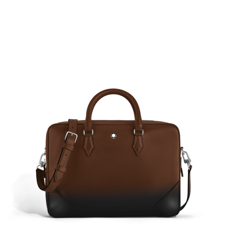 Élégant compagnon de voyage d'affaires, ce porte-documents témoigne du savoir-faire artisanal de Montblanc. Confectionné en cuir de veau Meisterstück marron lisse avec un effet Sfumato peint à la main, ses coutures, ses tirettes de fermeture éclair et ses poignées évoquent la forme d'une plume, en hommage à l'héritage de Montblanc en matière d’écriture. À l'intérieur, de multiples poches offrent encore plus de fonctionnalité, tandis que les poignées supérieures en cuir, la bandoulière amovible en cuir et le système satellite offrent des options de transport polyvalentes.